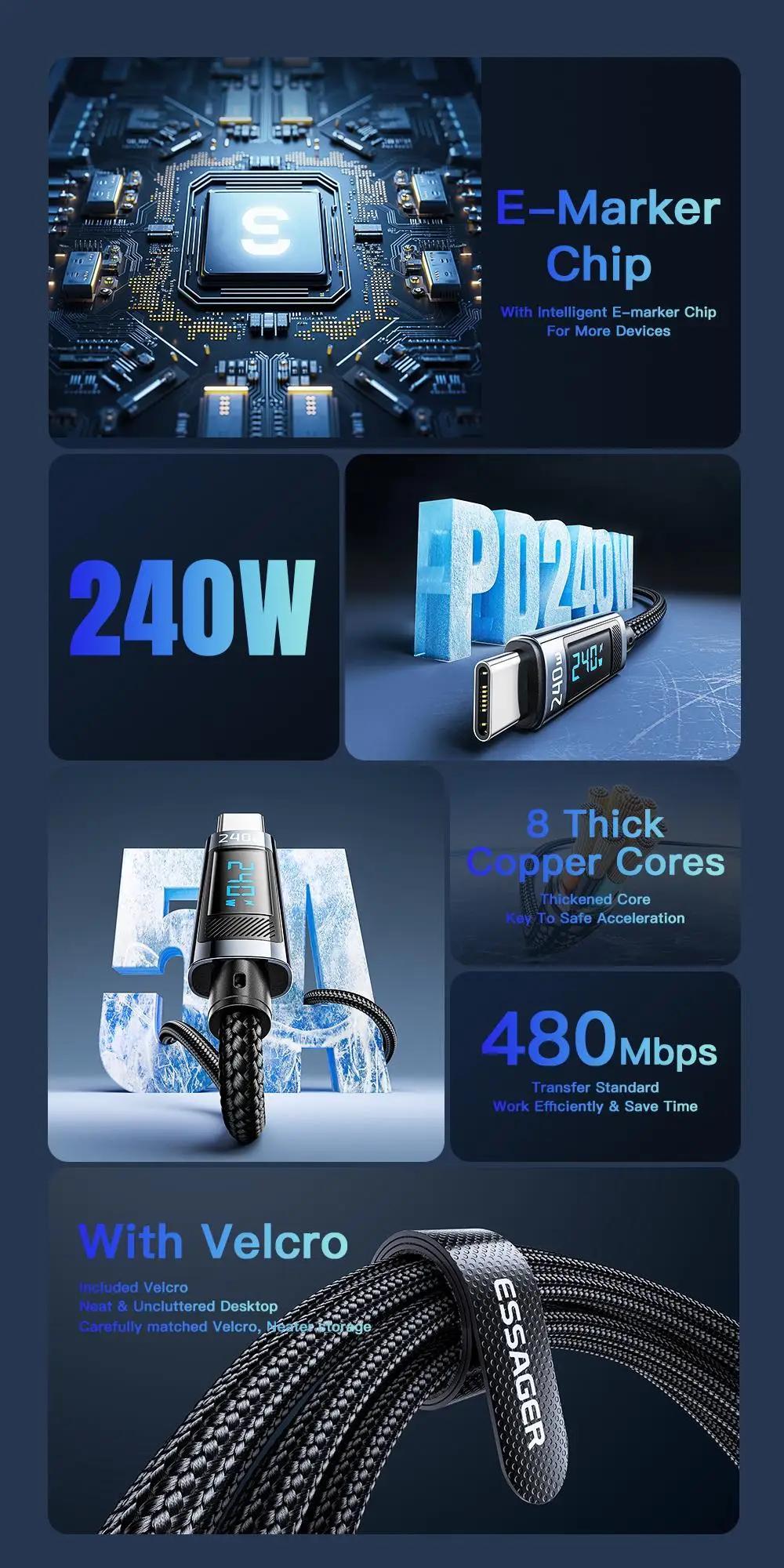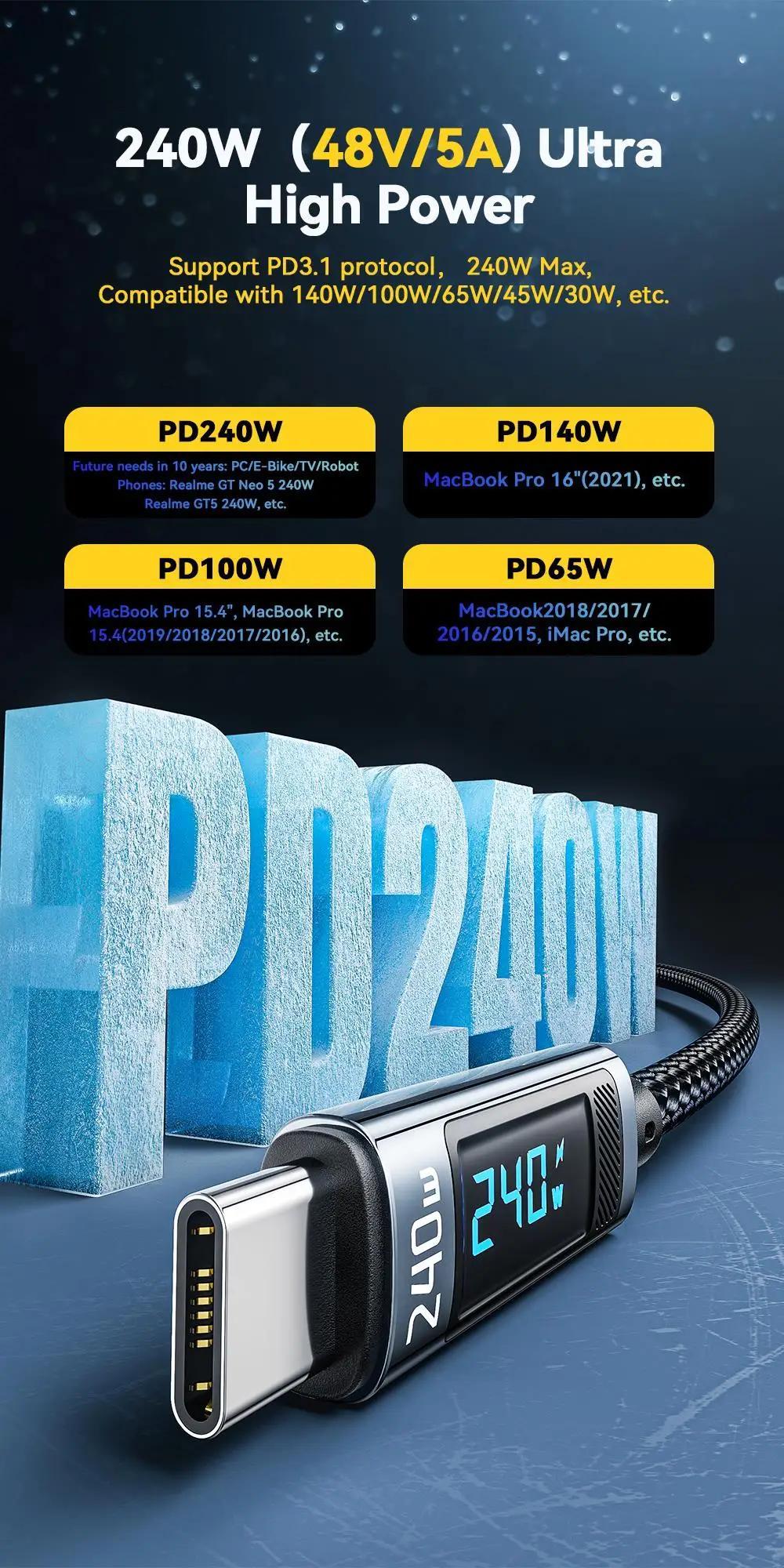 Essager 240W USB-C to USB-C Cable, 100W PD 3.1 Fast Charge, Fabric Flat Data Cord with Glossy Finish, Male to Male, Compatible with MacBook Pro, Xiaomi, and Laptops - ESSAGER Brand, No Battery, 39.37inch/78.74inch
